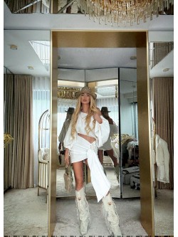 The set is made of cotton muslin in an ecru shade in boho style. The blouse has a shorter, loose cut finished at the bottom with a drawstring that allows it to be adjusted to your figure. The long, wider sleeves feature the same tying element at the bottom, which can be adjusted or untied, creating a unique effect with a loose puff. It features a straight-cut neckline. The mini skirt has an 'A' shape with ties on the sides using drawstrings. Additionally, on the left side, there are decorative straps going from the tie, giving an asymmetrical effect.