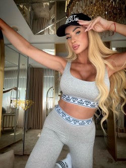 Top ajusté en viscose élastique de couleur grise. La coupe à bretelles larges possède en bas un élastique de couleur blanche, logoté avec des diamants noirs.