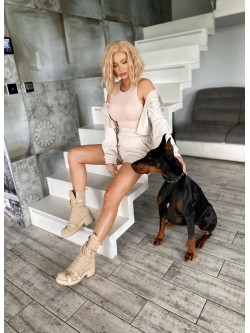 Cotton shorts made of linen material in a cool beige color. High waist with an elastic band that fits perfectly at the waist, and a ruffle. It has pockets in the front, and two buttoned pockets in the back.