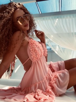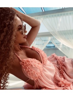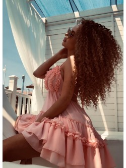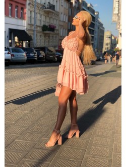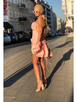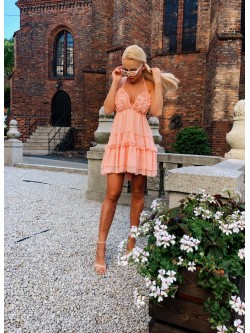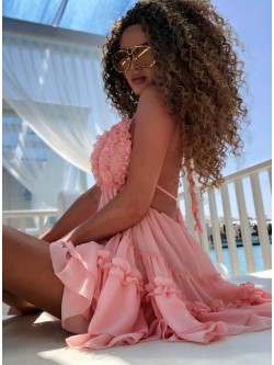 Krótka sukienka w odcieniu pudrowego różu wykonana z szyfonu. Model posiada głęboko wycięty dekolt udekorowany falbankami oraz wiązanie na szyi za pomocą sznureczka plecionego w warkocz. Pod biustem wszyta elastyczna gumka. Sukienka posiada efektowne wycięcie na plecach. Dół sukienki obszyty jest w dwóch miejscach ozdobną falbanką. Posiada pod spodem podszewkę.