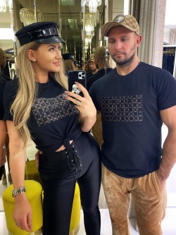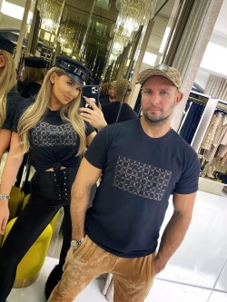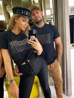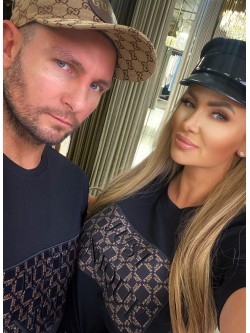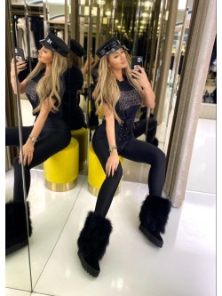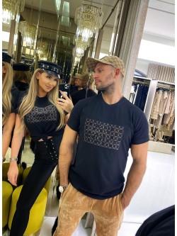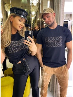 Women's blouse in black color made of cotton material. The front features a black embroidered Just Unique logo, which is on an insert made of black velvet with a beige logo in a square pattern. Model with a classic neckline and short sleeves finished with a turn-up.