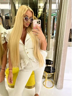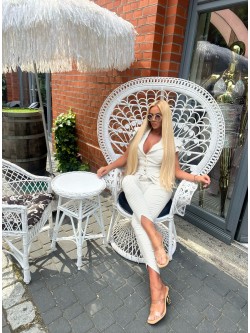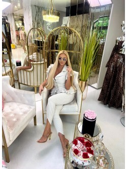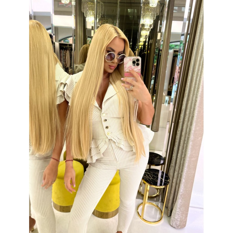 Spodnie wykonane z bawełnianej eleganckiej tkaniny w beżowo-białe paski, która jest elastyczna, a jednocześnie sztywno się układająca. Dopasowany krój z bardzo wysokim stanem, które posiada kilka przeszyć wokół dodatkowo podkreślające talię. Zapinane z przodu na kryty zamek ze złotym diamentem. Dół nogawek zakończony lekkim wycięciem do góry.