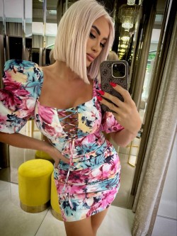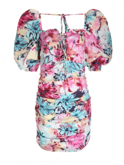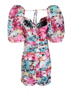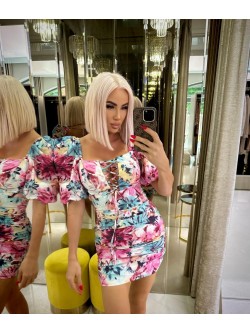 Sukienka o dopasowanym kroju wykonana bawełnianej tkaniny w piękny malowniczy wzór kwiatów. Nieco wycięty dekolt z wiązaniem z przodu, które dekoruje sukienkę i dodatkowo daje możliwość regulacji. Krótkie bufiaste rękawy zakończone są na ramionach i na dole elastycznymi ściągaczami, dzięki czemu można je także opuścić i stworzyć prosty dekolt. Z tyłu od rękawów poprowadzone są sznureczki, które wiązane są na plecach regulując je. Poniżej sukienka ma dopasowany krój z marszczeniami po całej długości podkreślając figurę - ulubiony element naszych klientek. Model zapinany na wszyty zamek z tyłu.