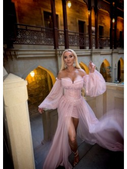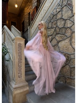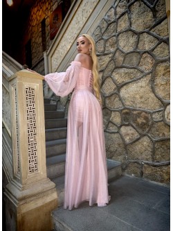 The dress is made of beautiful tulle in the color of powdered pink, entirely adorned with shimmering, tiny elements. The 4in1 product offers several possibilities to create different versions of the outfit with all elements, as well as without sleeves or a maxi skirt. We base it on a fitted dress with a corset top - it has sewn-in boning around it, thanks to which the dress adapts perfectly and drapes beautifully. It features a tie at the back that decorates and exposes the back, additionally allowing for corset adjustment. The delicately cut heart-shaped neckline is adorned with subtle ruffles, just like the sleeves at the top and bottom. The gathering from the waist down is a favorite element among our clients, which perfectly highlights the figure. Separately worn loose sleeves are finished at the bottom and top with elastic bands. They connect to the dress with ties through strings. Another separately worn element is the maxi-length skirt with a slit along the front, which has a zipper at the back. The dress has a mesh lining and a zipper below the waist at the back.