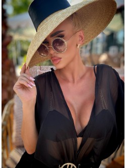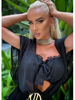 The set is made of airy silk chiffon in black. The model consists of a jumpsuit with a deep V-shaped neckline at the front and back, complemented by a top. The neckline is adjustable at the back with a tie, which prevents slipping. The short wide open sleeves present effectively, giving a flowing and unique look! There are drawstrings on the shoulders threaded through a tunnel, allowing for adjusting the width of the sleeves, creating gathers. An elastic band is sewn into the waist, which, together with the gathered belt with a gold buckle, accentuates the waist femininely. The bottom is in the form of shorts, which, due to the amount of fabric, look like a skirt. The top has a drawstring above and below the bust, which can be tied at the front with a chiffon strap, creating a different neckline.