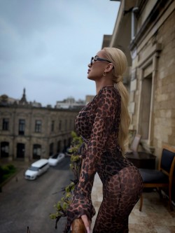 The two-piece set in leopard pattern is made of elastic mesh with a body-hugging effect. The top features a shorter cut with long sleeves that flare out at the bottom. The extended waistband allows for front tying, creating a feminine, adjustable neckline. The high-waisted pants include elastic in the waistband for a perfect fit. The fitted cut is knee-length, flaring out below.