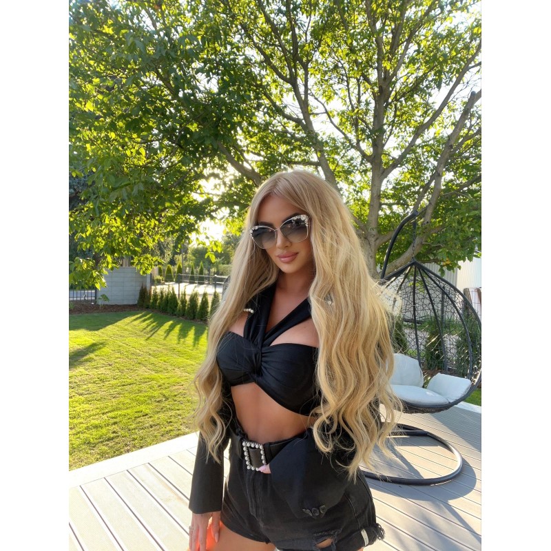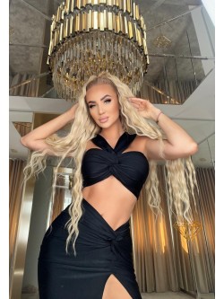 Top made of very stretchy and comfortable lycra in black color. Model with a weave in the middle front, from which two straps are led, beautifully fitting the body.