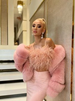 Exclusive top with natural ostrich feathers in powder pink. The model features a front entirely adorned with striking feathers that enhance the season. It is based on thin adjustable straps and three elastic lycra bands at the back, allowing for perfect fit. The model has a lining in a similar color scheme.