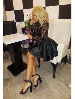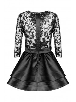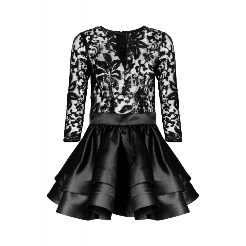 Rozkloszowana sukienka z podwójną warstwą czarnej satynowej falbanki dająca efekt uniesienia. Góra sukienki na długi rękawek uczyta jest z czarnej siateczki z aplikacja z cekinów. Przy szyi posiada czarne obszycie. Z tyłu zapinana na wszyty zamek.