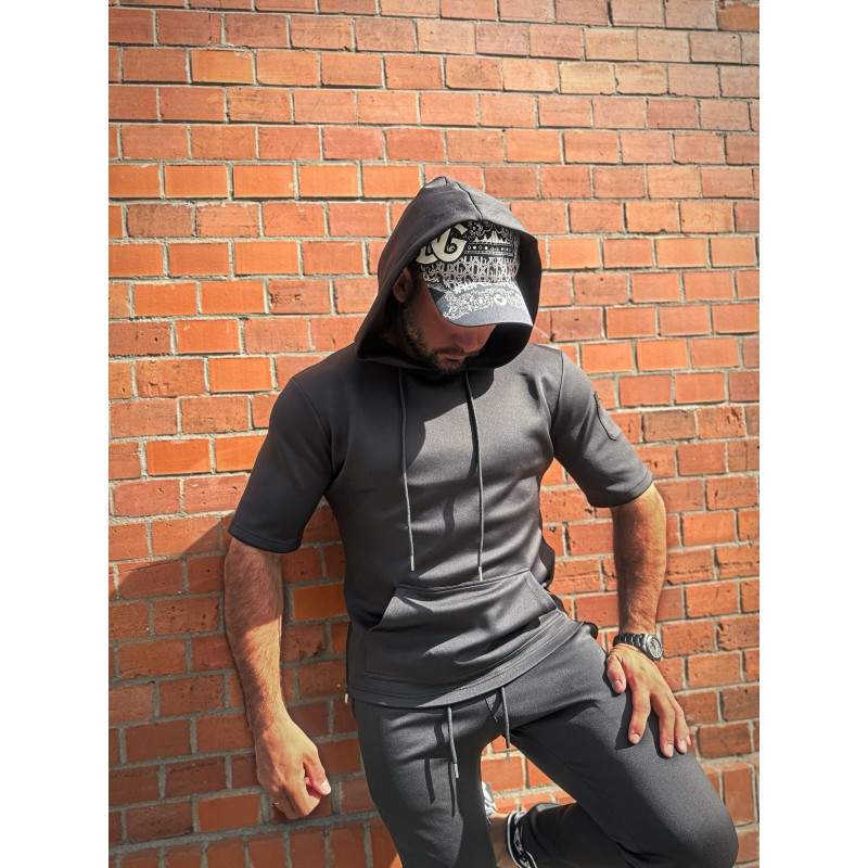 Sweter wykonany z elastycznej dzianiny "pianka" w czarnym kolorze. Luźniejszy fason na krótkie rękawy z dodatkiem kaptura, który ma wpuszczony sznurek w tunel wokół. W dolnej części znajduje się kieszeń typu kangur. Boki bluzy zakończone są na dole elementem suwaka z logowanym pullerem.