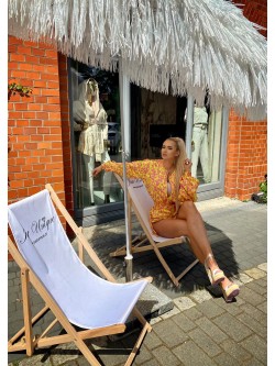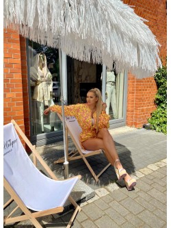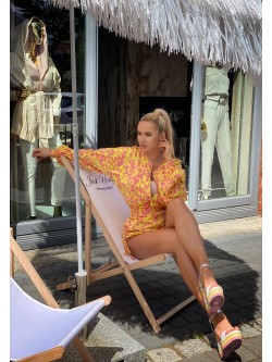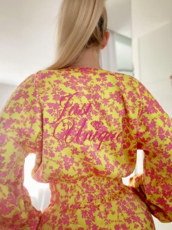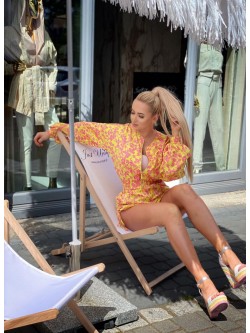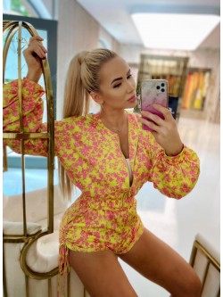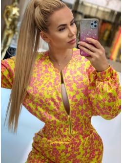 Dwuczęściowy komplet wykonany ze śliskiej, lejącej się tkaniny "silk satynowy" w pięknych wyrazistych kolorach. Żółty idealnie łączy się ze wzorem różowych kwiatów. Kurtka "bomber jacket" zapinana na złoty zamek posiada jasną podszewkę oraz różowe wyszywane logo z tyłu. Długie luźne rękawy i dół kurtki zakończone są ściągaczem. Spodenki z wysoki elastycznym stanem, kieszeniami oraz możliwością regulacji długości po bokach.