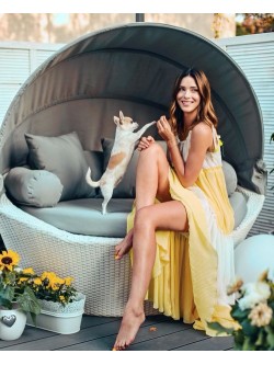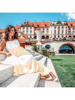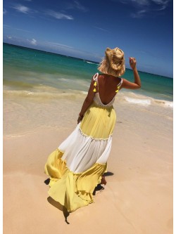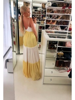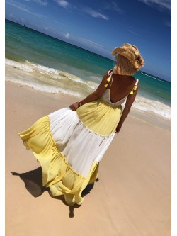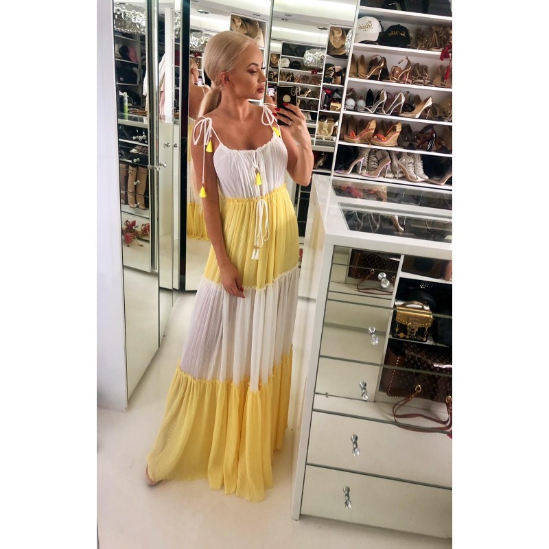 Sukienka maxi wykonana z połączenia dwóch kolorów (żółty i biały) z plisowanego materiału. Model na cienkie wiązane ramiączka z możliwością regulacji ich długości. Łagodny dekolt wiązany sznureczkiem , który zakończony jest ozdobnymi pomponikami w żółtym kolorze. W talii posiada sznurek wpuszczony w tunel, dający możliwość dopasowania do ciała z białymi pomponikami. Kobieco wycięty dekolt na plecach. Posiada pod spodem krótszą podszewkę.