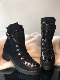 Czarne trapery całkowicie wykonane z naturalnej skóry zamszowej oraz licowej. Model logowany diamentem w górnej części, który zapinany jest na złotą klamrę. Z przodu posiada efektowne wiązanie od samej góry po łagodny czubek buta. Posiada wstawki imitacji skóry krokodyla na czubku, zapinanym diamencie, pasku oraz z tyłu. Posiada podeszwę o wysokości 3 cm z przodu oraz 6 cm z tyłu. Zapinane na zamek z boku.