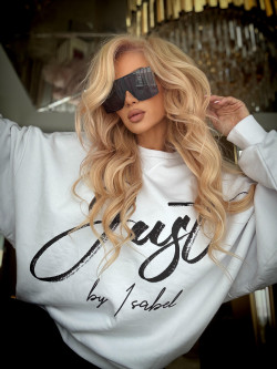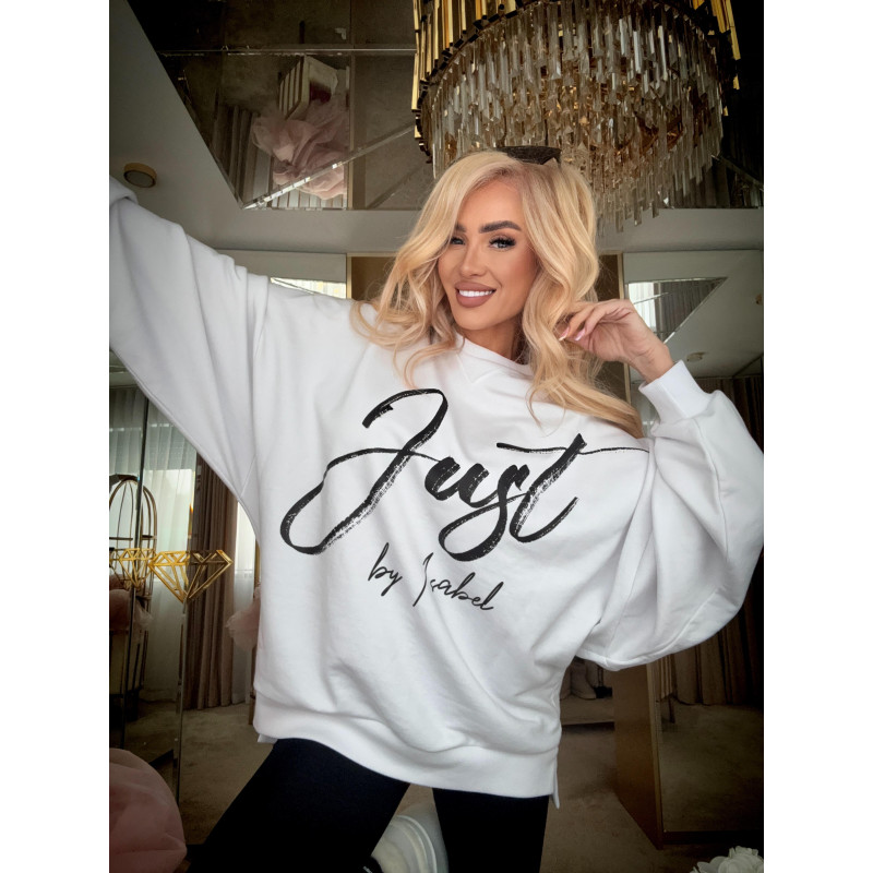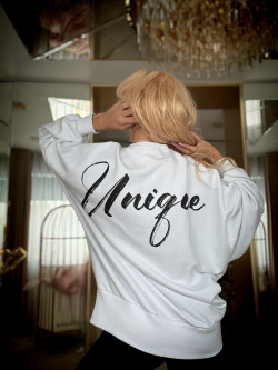 Luźniejszy, oversize’owy fason nadaje stylizacji swobodnej elegancji, jednocześnie zachowując kobiecy charakter. Przód bluzy zdobi wyrazisty, kontrastowy nadruk „Just by Isabel”, który podkreśla unikalność projektu. Tył przyciąga uwagę dużym napisem „Unique”, stanowiącym mocny, modowy akcent i znak rozpoznawczy kolekcji.