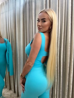 Turkusowy kombinezon z matowej lycry z dekoltem na plecach.