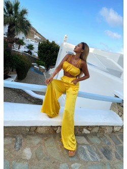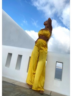 Dwuczęściowy limitowany komplet wykonany z lejącej się tkaniny satynowej w słonecznikowym odcieniu. Krótki top z wszytą elastyczną gumą na w dekolcie, jak i na dole, dzięki czemu się dopasowuje i utrzymuje. Materiał subtelnie zebrany tworząc marszczenia, a dodatkowo poprowadzone są cienkie dwa sznureczki z przodu, aby zawiązać je na szyi dodając efektowności. Spodnie z wysokim elastycznym stanem, kieszeniami i długimi szerokimi nogawkami.