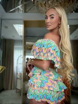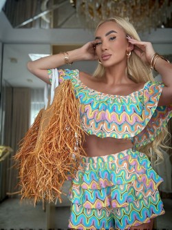 Dwuczęściowy komplet wykonana z pięknej wielokolorowej ażurowej tkaniny. Góra w formie topu z prosto ciętym dekoltem obszyty wokół długą falbanką. Dodatkowo dekolt jest na elastycznych gumach, tak jak dół topu, dzięki czemu idealnie się dopasowuje. Spodenki z wysokim stanem oraz wszytą elastyczną gumą mają świetny fason z 3 warstwami falbanek, tworząc krój spódniczki.
