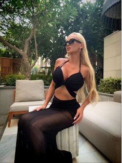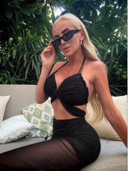 Dwuczęściowy komplet wykonany z elastycznej i pracującej siateczki w czarnym kolorze. Top wykonany jest z potrójnej siateczki. Zabudowany jest tylko z przodu z marszczeniami - po bokach posiada elastyczny siągacz ze sznureczkami do wiązania na plecach i szyi, które regulują dopasowanie topu. W zestawie znajduje się chusta, która służy do przewiązania topu z przodu, tworząc dekolt w kształcie kokardy, ale może mieć także inne zastosowanie, na przykład jako akcesoria do torebki, opaska na włosy. Spódniczka maxi z wysokim stanem o kroju syrenki posiada z tyłu przeszycia, tworzące efektowne marszczenia. Spódniczka wykonana jest z podwójnej warstwy siateczki do połowy uda, a poniżej ma pojedynczą warstwę z efektem przebijania na ciało jako beachwear.