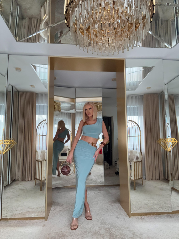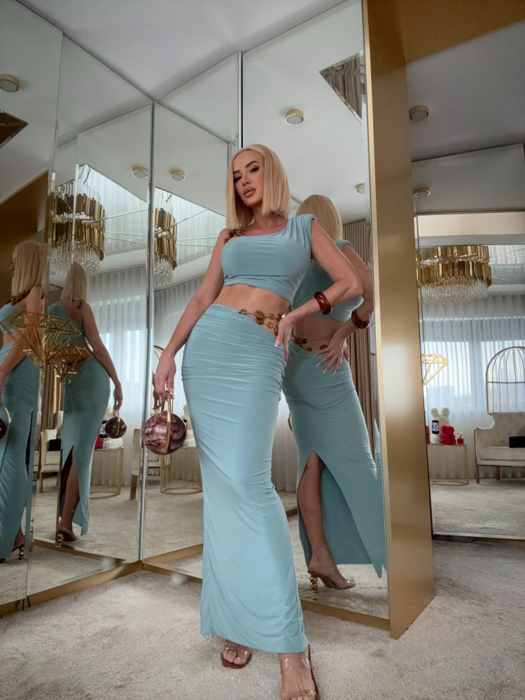 Zjawiskowy komplet, który łączy elegancję z nowoczesną formą i podkreśla kobiecą sylwetkę. Wykonany z elastycznego, miękkiego materiału, idealnie dopasowuje się do ciała, zapewniając komfort noszenia i efekt perfekcyjnego fitu.