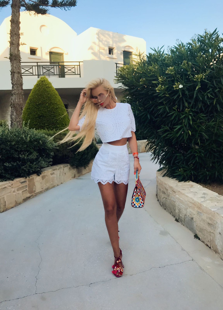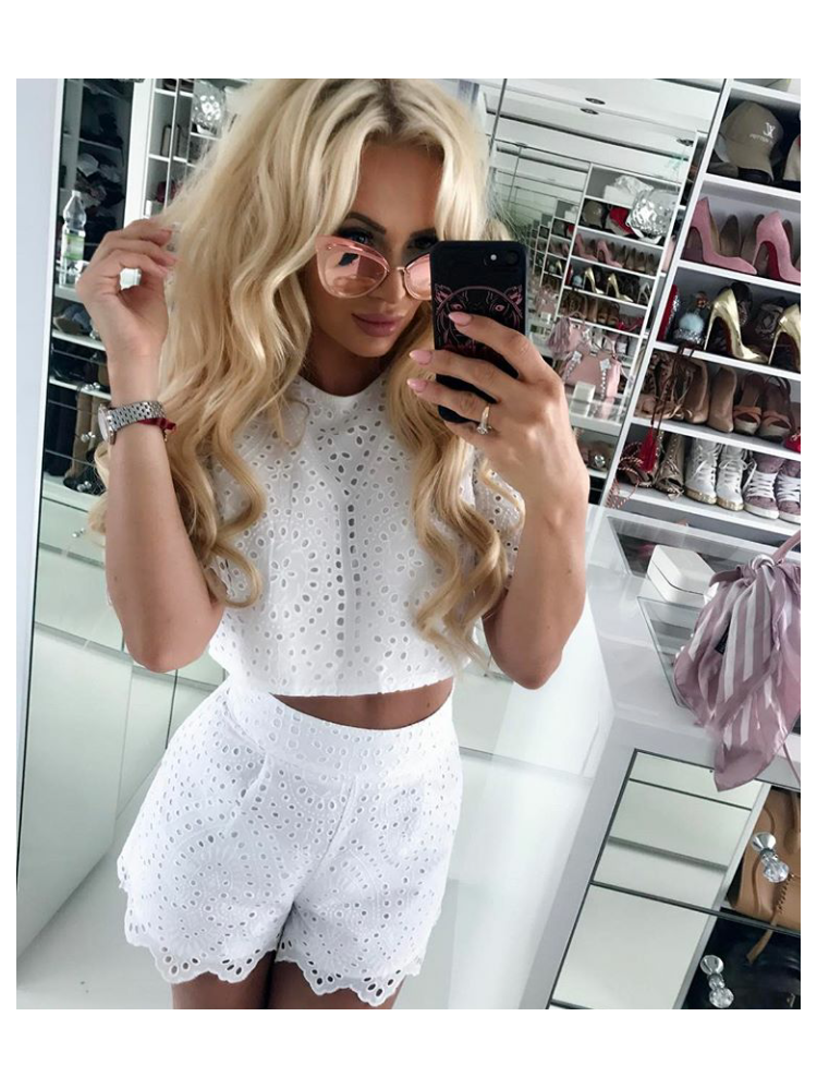 Biały, batystowy komplet składający się z bluzki oraz szortów. Bluzka z rękawkiem 1/2, ozdobiona pięknym haftem, zapinana z tyłu na guziczki. Szorty z wysokim stanem, haftowane po całości. Zapinane na kryty zamek.