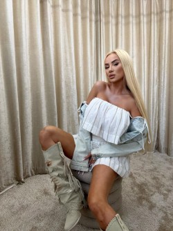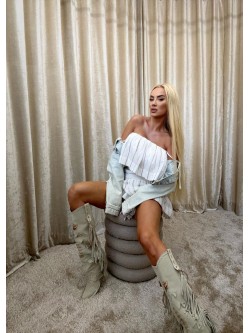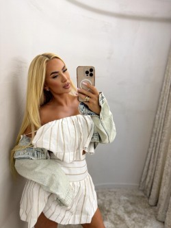 Top wykonany w 100% z bawełnianego batystu w ecru kolorze, który zdobiony jest złotymi, mieniącymi się aplikacjami. Top ma luźny krój a pod spodem znajduje się biała podszewka/top z wszytą gumką na górze jak i na dole. Top ma wszyte sznurki do zawiązania na ramionach.