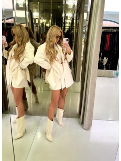 Marynarka o kroju oversize wykonana wykonana z bardzo miłej w dotyku tkaniny w odcieniu jasnego beżu. Model posiada haftowane logo w podobnym odcieniu z tyłu w górnej części w formie napisu Just Unique. Klasyczny dekolt z kołnierzykiem i klapami zapinany z przodu na dwa guziki. W dolnej części marynarki znajdują się dwie kieszenie, natomiast w górnej po lewej stronie imitacja kieszeni. Dodatkowo na ramionach wszyte są cienkie poduszki. Z tyłu marynarki znajduje się elastyczny ściągacz, który zdobi marynarkę. Długie rękawy posiadają ozdobę w postaci 5 guzików. Dół marynarki posiada rozcięcia po bokach oraz z tyłu. Model z jaśniejszą podszewką.