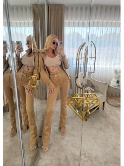 Kurtka o niezwykle unikatowym kroju wykonana z niezwykle przyjemnego, elastycznego zamszu w pięknym karmelowym odcieniu. Luźny oversize styl ze specjalnym efektem opadających, szerokich ramion, co fenomenalnie wysmukla sylwetkę w połączeniu ze zwężoną talią. Przód kurtki zdobią podwójne, srebrne suwaki wzdłuż, z czego jeden jest elementem ozdobnym, oraz srebrne napy w górnej czy dolnej części. W dolnej części kurtki znajdują się dwie kieszenie zapinane na ten sam element suwaka z logowanym pullerem oraz pas poprowadzony od boków, którym jest możliwość dopasowania kurtki w talii. Posiada beżową, logowaną podszewkę.