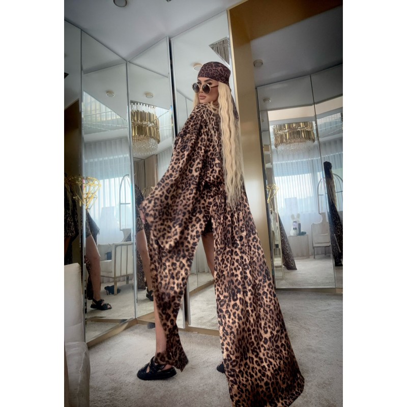 Długa narzutka wykonana z satynowej, lekko połyskującej tkaniny we wzór panterki w kolorystyce czarno-brązowej - stanowi idealne uzupełnienie jako beachwear, ale także całej stylizacji. Luźny krój dopasowuje się w talii za pomocą pasków. Dodatkowo z tyłu znajduje się elastyczny ściągacz od którego są one poprowadzone - pasy są przyszyte, dzięki czemu nie spadają. Długie rękawy są rozszerzane ku dołowi. Fason w dolne części posiada rozcięcia wzdłuż boków.