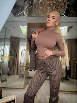 Spodnie o kobiecym i eleganckim kroju, który idealnie wpasowuje się w jesienno-zimowe trendy! Wykonane są z pięknej tkaniny we wzór pepitki w brązowo-czarnej kolorystyce. Model z wysokim stanem zapinany jest na guzik oraz kryty zamek. Dodatkowym elementem jest wstawka z ekoskóry w karmelowym odcieniu wokół talii oraz z tyłu na biodrach jako imitacja kieszonki - nadaje to unikatowego efektu. Długie nogawki w kant o nieco szerszym kroju zakończone na dole wywinięciem.