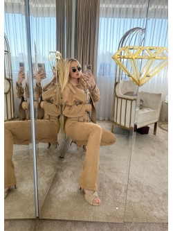Spodnie wykonane z niezwykle przyjemnego, elastycznego zamszu w pięknym karmelowym odcieniu. Świetnym elementem spodni jest bardzo wysoki, podwójny stan zapinany na logowane, srebrne napy oraz zamek. Tył spodni ozdobiony jest w talii skórzaną, beżową wstawką z elementem logo oraz przeszyciami, które podkreślają figurę. Dodatkowo z przodu znajdują się kieszenie. Nogawki ku dołowi mają nieco rozszerzany krój zakończony od wewnątrz wszytym suwakiem, dając możliwość ich rozpięcia, co fenomenalnie prezentuje się ze szpikami czy botkami.