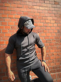Bluzka wykonana z elastycznej dzianiny "pianka" w czarnym kolorze. Luźniejszy fason na krótkie rękawy z dodatkiem kaptura, który ma wpuszczony sznurek w tunel wokół. W dolnej części znajduje się kieszeń typu kangur. Boki bluzy zakończone są na dole elementem suwaka z logowanym pullerem.