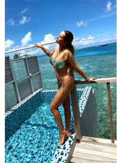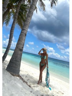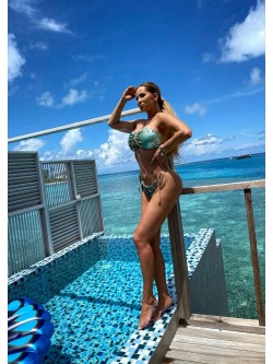 Bikini wykonane z efektownych dwustronnych cekin - miętowe w macie i po drugiej stronie złote, które pięknie mienią się w słońcu. Góra wiązana z tyłu, a przód jest tkaniną na wzór kokardy. Od tego łączenia poprowadzone są dodatkowo sznureczki do wiązania wokół szyi. Dół w klasycznym kroju ze sznureczkami po bokach, dzięki którym się je dopasowuje. Posiada cekiny tylko z przodu, a z tyłu znajduje się brązowa lycra z marszczeniem wzdłuż. W tym samym kolorze są sznureczki do wiązania jak i podszewka.