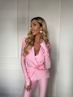 Dwuczęściowe bikini wykonane jest z uwielbianej przez Was elastycznej i komfortowej lycry w pięknym, cukierkowym różu. Góra w formie topu na cienkie, wiązane ramiączka z efektem zebrania z przodu, co tworzy kobiecy dekolt. Dodatkowo po bokach posiada wszyte fiszbiny, dzięki czemu góra od stroju idealnie się trzyma i może także służyć jako top do spodni czy bluzki PAIGE z tej samej serii. Zapinany z tyłu na złote guziki z kryształkami. Dół bikini z wysokim stanem, który z przodu i z tyłu posiada elastyczny ściągacz.