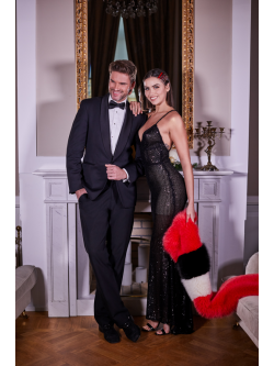 Długa sukienka w całości wykonana z mieniących się cekin w czarnym kolorze. Kobieco wycięty dekolt na ramiączka, które z tyłu na plecach układają się na krzyż. Dzięki temu są wyeksponowane ramiona oraz plecy. Dopasowana z coraz to luźniejszym dołem. Sukienka posiada podszewkę o długości mini.