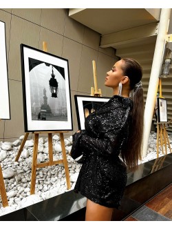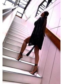 Sukienka wykonana w całości z mieniących się czarnych cekin o kroju luźnej koszuli. Posiada kołnierzyk jak i czarne guziki po całej długości, na które możecie zapiąć sukienkę bądź zostawić otwarty dekolt. Rękawy zakończone są eleganckimi mankietami, czyli to co wiele z Was uwielbia. W zestawie znajduje się pasek z tej samej tkaniny do przewiązania w talii.