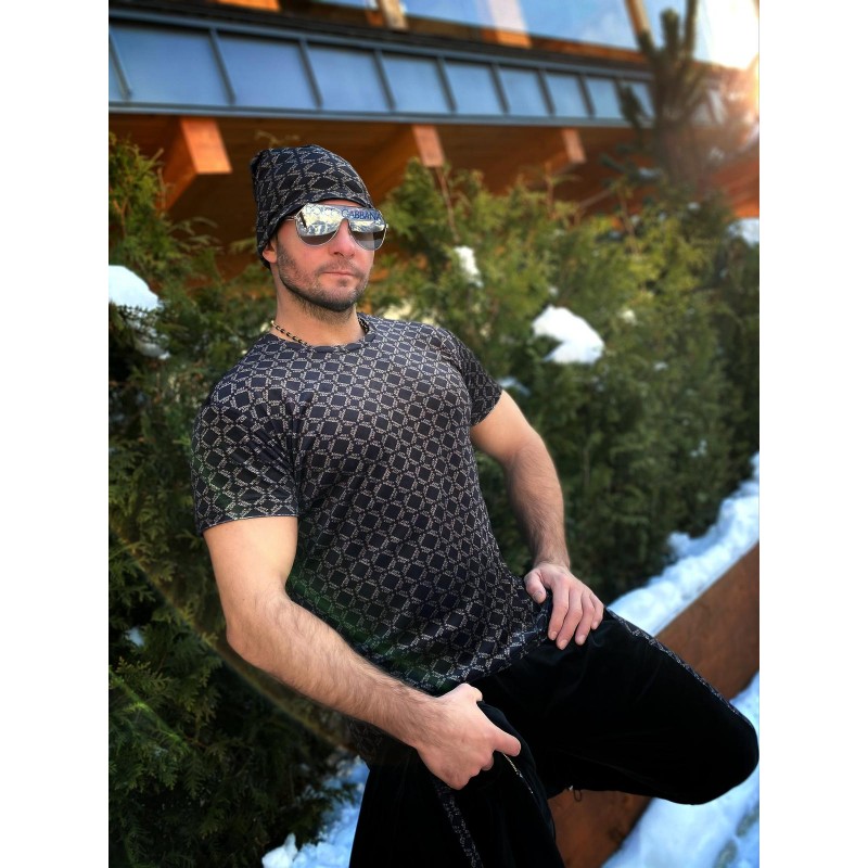 Dłuższa bluzka wykonana z bardzo przyjemnego i miłego w dotyku weluru w czarnym kolorze. Model jest we wzór naszego beżowego logo na kształt kwadratów. Bluzka z klasycznym dekoltem na krótki rękaw idealnie pasuje do dresu welurowego VICTORY MAN oraz kompletu ROYAL, w którego skład wchodzi czapka i szalik, tworząc świetny komplet. Wykonana z bardzo elastycznego weluru.