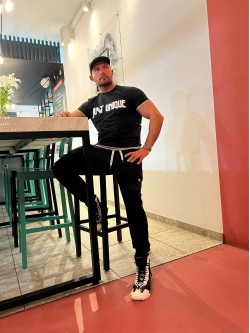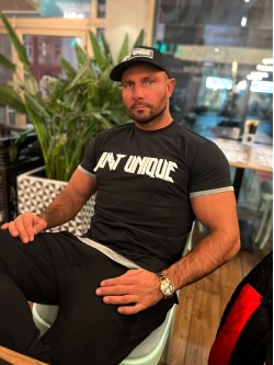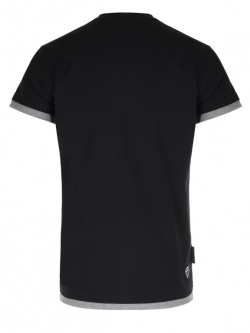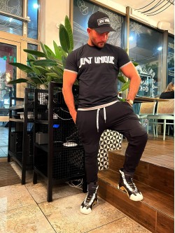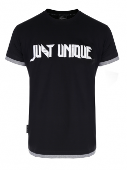 Bawełniany męski t-shirt w czarnym kolorze z dodatkiem efektownego logo JUST UNIQUE 3D z przodu w białym kolorze i nowej charakternej czcionce. Model na krótkie rękawy z dodatkiem haftowanego subtelnego logo w postaci małego męskiego diamentu w białym kolorze. Z boku wszyta jest czarna metka z logo Just Unique oraz wewnątrz logowana lamówka wokół szyi z tyłu. Rękawy i dół bluzy zakończone są wstawką z szarej tkaniny, która wystaje.