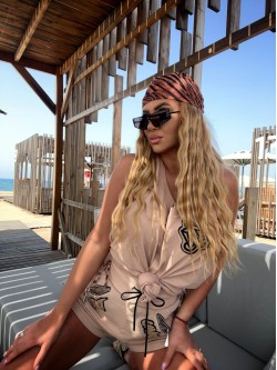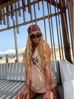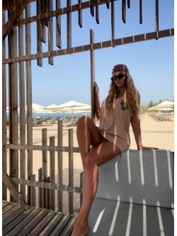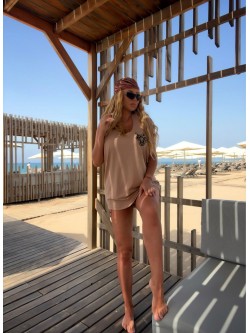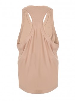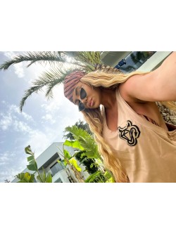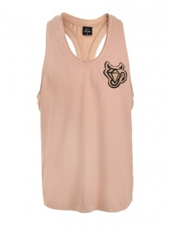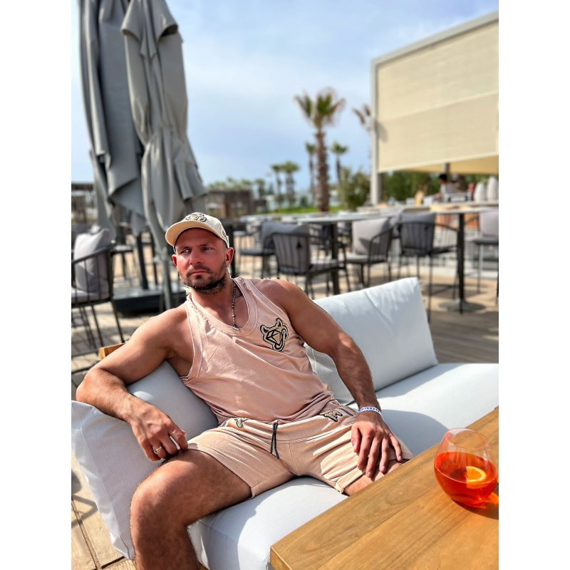 Męski bawełniany t-shirt typu tank top w odcieniu beżu zdobiony naszywką w beżowym kolorze metodą chenille (haft pętelkowy wykonywany włóczką) - w górnej części po lewej stronie w kształcie diamentu "diabełka". Model z dekoltem O-neck z głębszymi wycięciami od pachami oraz z tyłu na plecach.